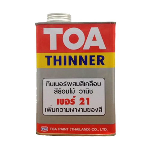 ทีโอเอ ทินเนอร์ เบอร์ 21 ผลิตจากตัวทำละลายอินทรีย์แบบผสม ใช้สำหรับเจือจางสีย้อมไม้และสีเคลือบเงาแอลคีด ช่วยให้สีซึมลึกเข้าสู่เนื้อไม้ได้ดีเยี่ยม เพิ่มการยึดเกาะ ทำให้ฟิล์มเรียบ และมีความเงาสูง