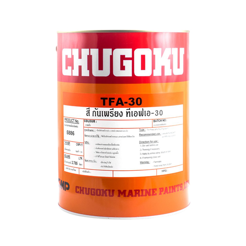 สีกันเพรียง TFA30 CHUKOKU LightBlue-เป็นสีกันเพรียงสำหรับใช้งาน 36-48 เดือน ขึ้นอยู่กับความหนาที่ทา ฟิล์มสีค่อนข้างแข็ง เหมาะกับการใช้งานกับเรือที่วิ่งด้วยความเร็วปานกลางถึงสูง ปราศจากสารดีบุก ไม่ทำลายสิ่งแวดล้อมในทะเล มีคุณสมบัติที่สามารถทาทับสีกันเพรียงเก่าได้ ใช้งานง่ายทั้งเรือใหม่และเรือเก่าซ่อมบำรุง