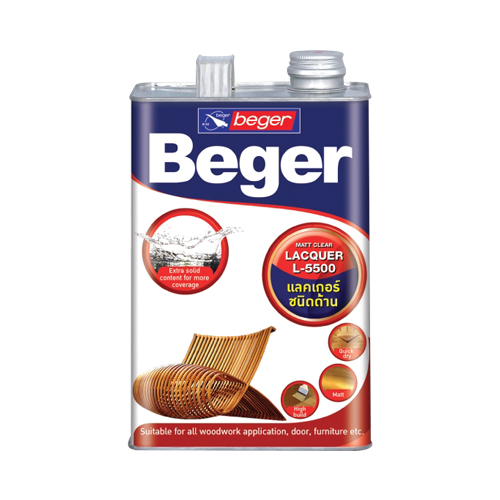 แลคเกอร์ด้านใส L-5500 BEGER 0.875Lเป็นแลคเกอร์คุณภาพสูง มีส่วนผสมของไนโตรเซลลูโลส และเรซิ่นสังเคราะห์เกรดพรีเมียม เนื้อสีเข้มข้นสูงสุด ขึ้นฟิล์มเร็ว ให้ฟิล์มสีหนา ยึดเกาะดีเยี่ยม ทนทานต่อรอยขีดข่วน กันน้ำ ไม่ลอกล่อน เหมาะสำหรับเฟอร์นิเจอร์ไม้ วงกบ ประดู หน้าต่าง ตู้และงานไม้ทุกประเภท